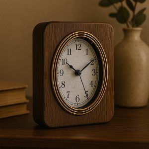 Vintage Style Wooden Table Clock – Oval Face with Gold Trim – Rustic Desk Decor – Silent Quartz – Antique-Inspired Timepiece