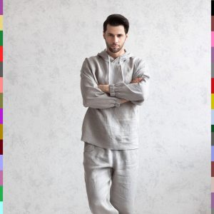 Linen Men’s Sportswear Set with Hood, Flax Suit, Long-Sleeved Linen Shirt and Long Pants with Elastic Waist and Pockets. Meditation Costume